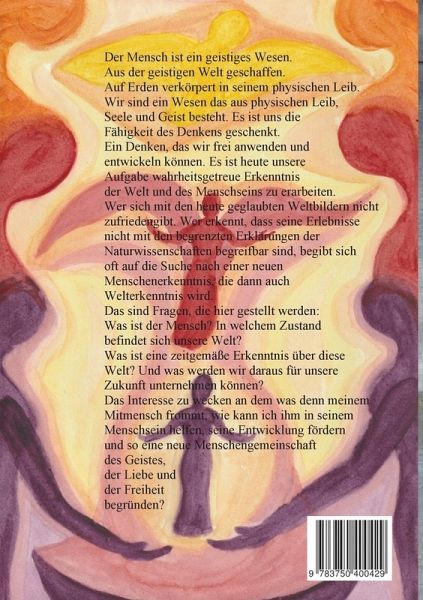 Der Mensch ist ein geistiges Wesen. Aus der geistigen Welt geschaffen. Auf Erden verkörpert in seinem physischen Leib. Wir sind ein Wesen das aus physischen Leib, Seele und Geist besteht. Es ist uns die Fähigkeit des Denkens geschenkt. Ein Denken, das wir frei anwenden und entwickeln können. Es ist heute unsere Aufgabe wahrheitsgetreue Erkenntnis der Welt und des Menschseins zu erarbeiten. Wer sich mit den heute geglaubten Weltbildern nicht zufriedengibt. Wer erkennt das seine Erlebnisse nicht mit den begrenzten Erklärungen der Naturwissenschaften begreifbar sind, begibt sich oft auf die Suche nach einer neuen Menschenerkenntnis, die dann auch Welterkenntnis wird. Das sind Fragen, die hier gestellt werden: Was ist der Mensch? In welchem Zustand befindet sich unsere Welt? Was ist eine zeitgemäße Erkenntnis über diese Welt? Und was werden wir daraus für unsere Zukunft unternehmen können? Das Interesse zu wecken an dem was denn meinem Mitmensch frommt, wie kann ich ihm in seinem Menschsein helfen, seine Entwicklung fördern und so eine neue Menschengemeinschaft des Geistes, der Liebe und der Freiheit begründen?Aufbauend in vier Stufen/Kapitel, erstens unserer erlebten Gegenwart, unserem naturwissenschaftlichen Weltbild, der heutigen Gesellschaft, Staats- und Regierungsformen sowie dem aktuellen Geistesleben und der genaueren Betrachtung der bestehenden Probleme. In der Mitte des Buches eine Erweiterung des naturwissenschaftlichen Weltbildes zu einem gesamtheitlichen Weltbild in christlich und hauptsächlich anthroposophischer, geisteswissenschaftlicher Ausarbeitung. Im dritten Kapitel die Selbstbewusstwerdung, das 'Ich bin', wie jeder Mensch an sich, seinen Eigenschaften und Fähigkeiten arbeiten kann. Und im vierten Kapitel eine Verwandlung der heutigen Welt in eine neue spirituell aufstrebende durchchristete Menschheit zu Ausdruck gebracht durch: 'Die Ich wollende Menschheit'.