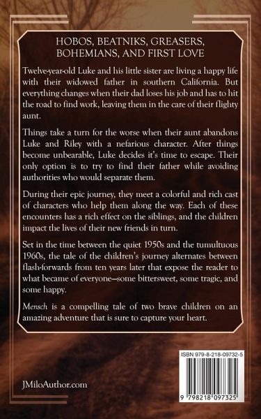 Hobos, Beatniks, Greasers, Bohemians, and First Love Twelve-year-old Luke and his little sister are living a happy life with their widowed father in southern California. But everything changes when their dad loses his job and has to hit the road to find work, leaving them in the care of their flighty aunt. Things take a turn for the worse when their aunt abandons Luke and Riley with a nefarious character. After things become unbearable, Luke decides it's time to escape. Their only option is to try to find their father while avoiding authorities who would separate them. During their epic journey, they meet a colorful and rich cast of characters who help them along the way. Each of these encounters has a rich effect on the siblings, and the children impact the lives of their new friends in turn. Set in the time between the quiet 1950s and the tumultuous 1960s, the tale of the children's journey alternates between flash-forwards from ten years later that expose the reader to what became of everyone-some bittersweet, some tragic, and some happy. Mensch is a compelling tale of two brave children on an amazing adventure that is sure to capture your heart.