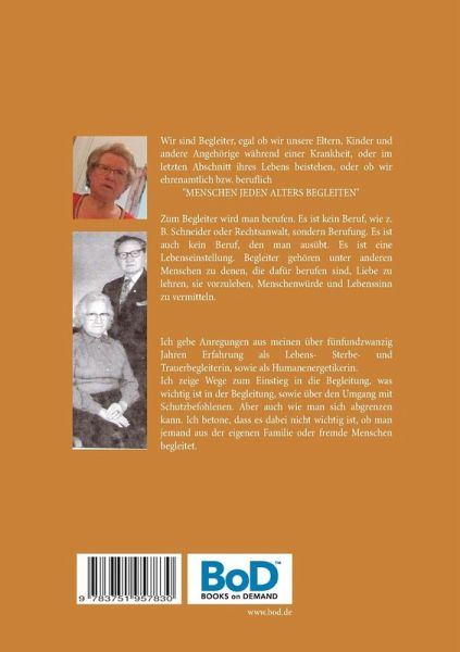 Wir sind Begleiter, egal ob wir unseren Eltern oder Angehörigen im letzten Abschnitt ihres Lebens beistehen, oder ob wir ehrenamtlich bzw. beruflich Menschen jeden Alters begleiten.Ich glaube, es ist die Liebe, die Nächstenliebe, die uns zu Begleitern macht. Weder ein Helfersyndrom oder unsere eigene Angst vor Krankheit, Einsamkeit, Alter, Sterben und Tod darf der Grund sein, jemanden zu begleiten. Ich rate jedem, sich unbedingt zu prüfen.Zum Begleiter wird man berufen. Es ist kein Beruf wie z. B. Schneider oder Rechtsanwalt, sondern eine Berufung. Es ist auch kein Beruf, den man ausübt. Es ist eine Lebenseinstellung. Begleiter gehören unter anderen Menschen zu denen, die dafür berufen sind, Liebe zu lehren, sie vorzuleben, Menschenwürde und Lebenssinn zu vermitteln.Ich gebe Anregungen aus meiner über fünfundzwanzigjährigen Erfahrung als Lebens-, Sterbe- und Trauerbegleiterin sowie als Humanenergetikerin.Ich zeige Wege zum Einstieg in die Begleitung, was wichtig ist in der Begleitung, sowie über den Umgang mit Schutzbefohlenen.Ich betone nochmals, dass es dabei nicht wichtig ist, ob man jemanden aus der eigenen Familie oder fremde Menschen begleitet.Besonders zeige ich aber Möglichkeiten, wie man sich selbst schützen kann, um nicht die Sorgen, Probleme oder Schmerzen anderer Menschen zu übernehmen.