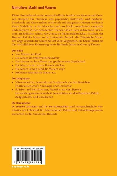 Dieser Sammelband vereint unterschiedliche Aspekte vonMauern undGrenzen. Beispiele für physische und psychische,historische und moderne, bestehende und überwundene sowie reale und imaginierteMauern werden in ihrem Verhältnis zu den Menschen und zur Macht exemplarischvorgestellt und analysiert. Zu den behandelten Themen zählen unter anderem einGrenzzaun im Südlichen Afrika, die Grenze im frühmittelalterlichen Kastilien,der Bau und Fall der Mauer an der Universität Rostock, die Chinesische Mauer, derlange Schatten der Mauer bei Ost-West-Vergleichen, die Kreml-Mauer als Ort derkollektiven Erinnerung sowie die Große Mauer in Game of Thrones.