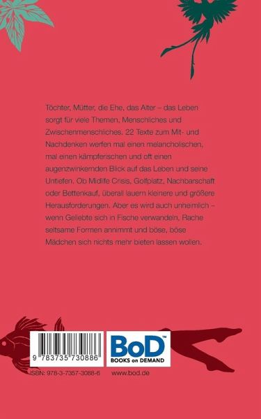 Töchter, Mütter, die Ehe, das Alter - das Leben sorgt für viele Themen, Menschliches und Zwischenmenschliches. 22 Texte zum Mit- und Nachdenken werfen mal einen melancholischen, mal einen kämpferischen und oft einen augenzwinkernden Blick auf das Leben und seine Untiefen. Ob Midlife Crisis, Golfplatz, Nachbarschaft oder Bettenkauf, überall lauern kleinere und größere Herausforderungen. Aber es wird auch unheimlich - wenn Geliebte sich in Fische verwandeln, Rache seltsame Formen annimmt und böse, böse Mädchen sich nichts mehr bieten lassen wollen