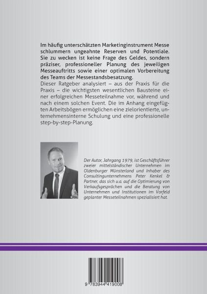 Im häufig unterschätzten Marketinginstrument Messe schlummern ungeahnte Reserven und Potentiale. Sie zu wecken ist keine Frage des Geldes, sondern präziser, professioneller Planung des jeweiligen Messeauftritts sowie einer optimalen Vorbereitung des Teams der Messestandsbesatzung. Dieser Ratgeber analysieert - aus der Praxis, für die Praxis - die wichtigsten wesentlichen bausteine einer erfolgreichen Messeteilnahme vor, während und nach einem solchen Event. Die im Anhang eingefügten Arbeitsbögen ermöglichen eine zielorientierte, unternehmensinterne Schulung und eine professionelle step-by-step-Planung.