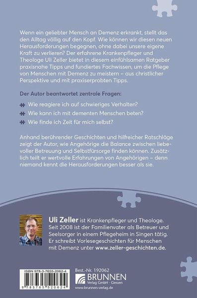 Wenn ein Familienmitglied an Demenz erkrankt, wird der Alltag auf den Kopf gestellt. In diesem Ratgeber bietet der erfahrene Krankenpfleger und Theologe Uli Zeller praxisnahe Tipps und beleuchtet die Pflege von Menschen mit Demenz aus einer christlichen Perspektive. Anhand persönlicher Geschichten und beruflicher Erfahrung zeigt der Autor, wie Angehörige die Herausforderungen der Demenzbetreuung mit Liebe, Geduld und Glauben meistern können, ohne sich dabei selbst zu überfordern. Der Ratgeber beantwortet Fragen wie: Wie kann man mit dementen Menschen beten? Wie reagiert man auf schwieriges Verhalten? Wie lässt sich die gemeinsame Zeit sinnvoll gestalten? Wie schaffe ich Zeit für mich selbst? Mit praktischen Handlungsanweisungen, christlichen Werten und hilfreichen Tipps aus seiner beruflichen Praxis bietet dieses Buch eine wichtige Stütze für Angehörige. Zusätzlich teilt Zeller wertvolle Ratschläge von anderen Betroffenen - denn Angehörige sind oft die besten Experten!