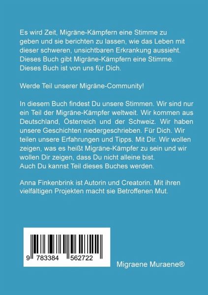 Es wird Zeit, Migräne-Kämpfern eine Stimme zu geben und sie berichten zu lassen, wie das Leben mit dieser schweren, unsichtbaren Erkrankung aussieht. Dieses Buch gibt Migräne-Kämpfern eine Stimme. Dieses Buch ist von uns für Dich. Werde Teil unserer Migräne-Community! In diesem Buch findest Du unsere Stimmen. Wir sind nur ein Teil der Migräne-Kämpfer weltweit. Wir kommen aus Deutschland, Österreich und der Schweiz. Wir haben unsere Geschichten niedergeschrieben. Für Dich. Wir teilen unsere Erfahrungen und Tipps. Mit Dir. Wir wollen zeigen, was es heißt Migräne-Kämpfer zu sein und wir wollen Dir zeigen, dass Du nicht alleine bist. Auch Du kannst Teil dieses Buches werden.Anna Finkenbrink ist Autorin und Creatorin. Mit ihren vielfältigen Projekten macht sie Betroffenen Mut.