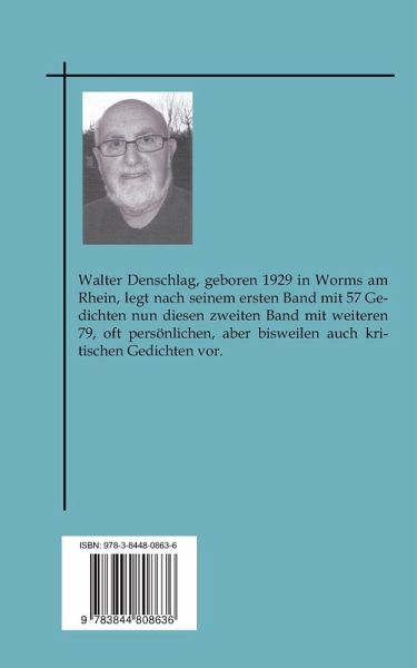 Eine Sammlung von 79 Gedichten mit Mundarteinschlag - Walter Denschlag, geboren 1929 in Worms am Rhein, legt nach seinem ersten Band mit 57 Gedichten nun diesen zweiten Band mit weiteren 79, oft persönlichen, aber bisweilen auch kritischen Gedichten vor.