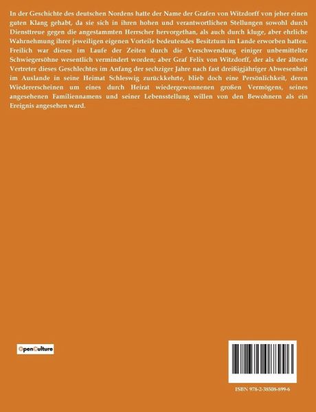 In der Geschichte des deutschen Nordens hatte der Name der Grafen von Witzdorff von jeher einen guten Klang gehabt, da sie sich in ihren hohen und verantwortlichen Stellungen sowohl durch Diensttreue gegen die angestammten Herrscher hervorgethan, als auch durch kluge, aber ehrliche Wahrnehmung ihrer jeweiligen eigenen Vorteile bedeutendes Besitztum im Lande erworben hatten. Freilich war dieses im Laufe der Zeiten durch die Verschwendung einiger unbemittelter Schwiegersöhne wesentlich vermindert worden; aber Graf Felix von Witzdorff, der als der älteste Vertreter dieses Geschlechtes im Anfang der sechziger Jahre nach fast dreißigjähriger Abwesenheit im Auslande in seine Heimat Schleswig zurückkehrte, blieb doch eine Persönlichkeit, deren Wiedererscheinen um eines durch Heirat wiedergewonnenen großen Vermögens, seines angesehenen Familiennamens und seiner Lebensstellung willen von den Bewohnern als ein Ereignis angesehen ward.