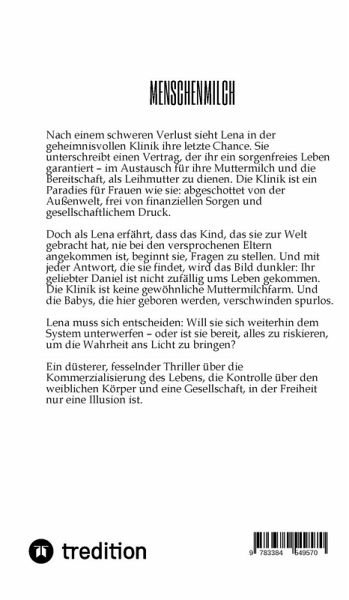 Nach einem schweren Verlust sieht Lena in der geheimnisvollen Klinik ihre letzte Chance. Sie unterschreibt einen Vertrag, der ihr ein sorgenfreies Leben garantiert - im Austausch für ihre Muttermilch und die Bereitschaft, als Leihmutter zu dienen. Die Klinik ist ein Paradies für Frauen wie sie: abgeschottet von der Außenwelt, frei von finanziellen Sorgen und gesellschaftlichem Druck.Doch als Lena erfährt, dass das Kind, das sie zur Welt gebracht hat, nie bei den versprochenen Eltern angekommen ist, beginnt sie, Fragen zu stellen. Und mit jeder Antwort, die sie findet, wird das Bild dunkler: Ihr geliebter Daniel ist nicht zufällig ums Leben gekommen. Die Klinik ist keine gewöhnliche Muttermilchfarm. Und die Babys, die hier geboren werden, verschwinden spurlos.Lena muss sich entscheiden: Will sie sich weiterhin dem System unterwerfen - oder ist sie bereit, alles zu riskieren, um die Wahrheit ans Licht zu bringen?Ein düsterer, fesselnder Thriller über die Kommerzialisierung des Lebens, die Kontrolle über den weiblichen Körper und eine Gesellschaft, in der Freiheit nur eine Illusion ist.