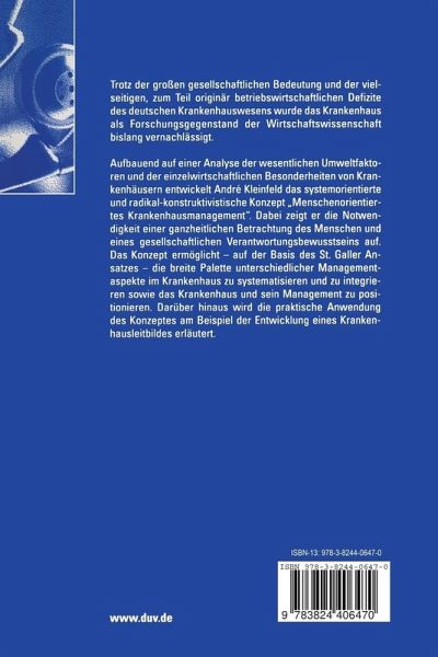 Aufbauend auf einer Analyse der wesentlichen Umweltfaktoren und der einzelwirtschaftlichen Besonderheiten von Krankenhäusern entwickelt André Kleinfeld das systemorientierte und radikal-konstruktivistische Konzept "Menschenorientiertes Krankenhausmanagement". Dabei zeigt er die Notwendigkeit einer ganzheitlichen Betrachtung des Menschen und eines gesellschaftlichen Verantwortungsbewusstseins auf. Das Konzept ermöglicht - auf der Basis des St. Galler Ansatzes - die breite Palette unterschiedlicher Managementaspekte im Krankenhaus zu systematisieren und zu integrieren sowie das Krankenhaus und sein Management zu positionieren. Darüber hinaus wird die praktische Anwendung des Konzeptes am Beispiel der Entwicklung eines Krankenhausleitbildes erläutert.