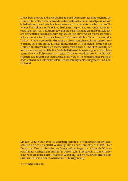 Die Arbeit untersucht die Möglichkeiten und Grenzen einer Einbeziehung der Normen des völkerrechtlichen Menschenrechtsschutzes in die allgemeine Vorbehaltsklausel des deutschen Internationalen Privatrechts. Nach einer einführenden Darstellung zu Funktion, Strukturprinzipien und Anwendungsvoraussetzungen von Art. 6 EGBGB gewährt die Untersuchung einen Überblick über die elementaren Bestandteile des regionalen und universellen Menschenrechtsschutzes und seiner Überwachung auf völkerrechtlicher Ebene. Im zentralen Teil der Arbeit werden die Grundlagen einer menschenrechtsbezogenen Anwendung der ordre public-Klausel aufgezeigt. Es wird dargelegt, inwieweit die Normen des internationalen Menschenrechtsschutzes zur Konkretisierung der international-privatrechtlichen Vorbehaltsklausel herangezogen werden können und welche Folgerungen sich dabei für die Anwendung von Art. 6 EGBGB ergeben. Die Ergebnisse dieses Abschnitts werden im Schlußkapitel exemplarisch anhand des internationalen Eheschließungsrechts umgesetzt und konkretisiert.