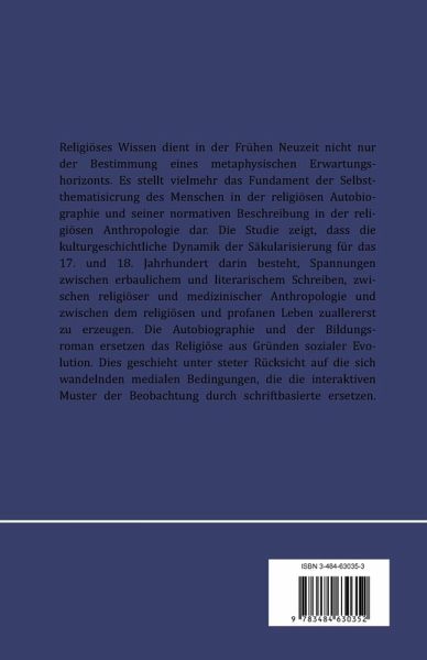 In the early modern age, religious knowledge was not limited to the prospective definition of metaphysical expectations. It served rather as the basis for reflection on, and normative description of, the human self in religious autobiographies and religious anthropology. This study demonstrates that for the 17th and 18th centuries the culture-historical dynamics of secularization consisted in the generation of tensions between edifying and literary writing, religious and medical anthropology, and religious and secular life. Social evolution occasioned the supplanting of religious concerns by autobiography and the Bildungsroman. This process took place in constant conjunction with the changing media landscape, replacing interactive patterns of observation with writing-based alternatives.