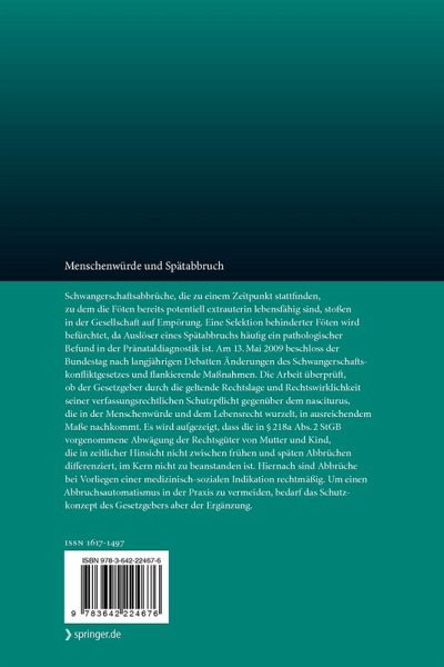Schwangerschaftsabbrüche, die zu einem Zeitpunkt stattfinden, zu dem die Föten bereits potentiell extrauterin lebensfähig sind, stoßen in der Gesellschaft auf Empörung. Eine Selektion behinderter Föten wird befürchtet, da Auslöser eines Spätabbruchs häufig ein pathologischer Befund in der Pränataldiagnostik ist. Am 13. Mai 2009 beschloss der Bundestag nach langjährigen Debatten Änderungen des Schwangerschaftskonfliktgesetzes und flankierende Maßnahmen. Die Arbeit überprüft, ob der Gesetzgeber durch die geltende Rechtslage und Rechtswirklichkeit seiner verfassungsrechtlichen Schutzpflicht gegenüber dem nasciturus, die in der Menschenwürde und dem Lebensrecht wurzelt, in ausreichendem Maße nachkommt. Es wird aufgezeigt, dass die in § 218a Abs. 2 StGB vorgenommene Abwägung der Rechtsgüter von Mutter und Kind, die in zeitlicher Hinsicht nicht zwischen frühen und späten Abbrüchen differenziert, im Kern nicht zu beanstanden ist. Hiernach sind Abbrüche bei Vorliegen einer medizinisch-sozialen Indikation rechtmäßig. Um einen Abbruchsautomatismus in der Praxis zu vermeiden, bedarf das Schutzkonzept des Gesetzgebers aber der Ergänzung.