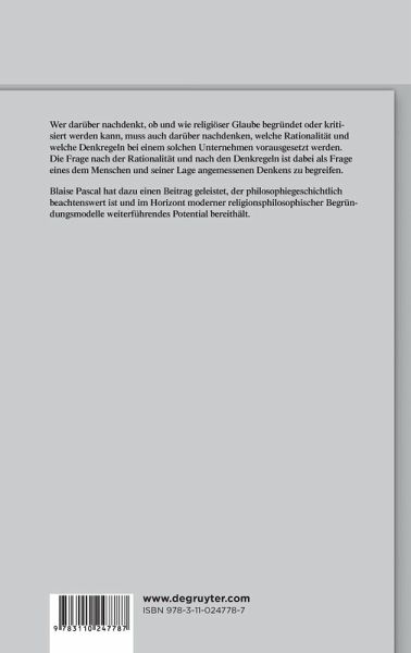 Blaise Pascal hat dazu einen Beitrag geleistet, der philosophiegeschichtlich beachtenswert ist und im Horizont moderner religionsphilosophischer Begründungsmodelle weiterführendes Potential bereithält. Erkenntnistheorie und Begründungstheorie werden zurückgebunden an anthropologische Reflexionen über die Fähigkeiten und Grenzen des Menschen und über die Kontextualität seines Daseins.