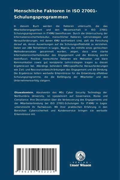 In diesem Buch werden die Faktoren untersucht, die das Mitarbeiterengagement und den Wissenserhalt in ISO 27001-Schulungsprogrammen in IT-KMU beeinflussen. Durch die Untersuchung der Informationssicherheitskultur, menschlicher Faktoren, Lehrstrategien und Herausforderungen, mit denen KMU konfrontiert sind, zielt die Forschung darauf ab, deren Auswirkungen auf die Schulungseffektivität zu verstehen. Daten von 288 Teilnehmern in Lagos, Nigeria, die mithilfe eines gemischten Methodenansatzes gesammelt wurden, zeigen, dass eine starke Informationssicherheitskultur das Engagement und die Bindung positiv beeinflusst. Positive menschliche Faktoren wie Motivation und klare Kommunikation sowie gut konzipierte Lehrstrategien tragen zu diesen Ergebnissen bei. Allerdings behindern KMU-spezifische Herausforderungen wie Zeit- und Ressourcenbeschränkungen das Engagement und die Bindung. Die Ergebnisse liefern wertvolle Erkenntnisse für die Entwicklung effektiver Schulungsprogramme, die die Befähigung der Mitarbeiter und den Unternehmenserfolg steigern.