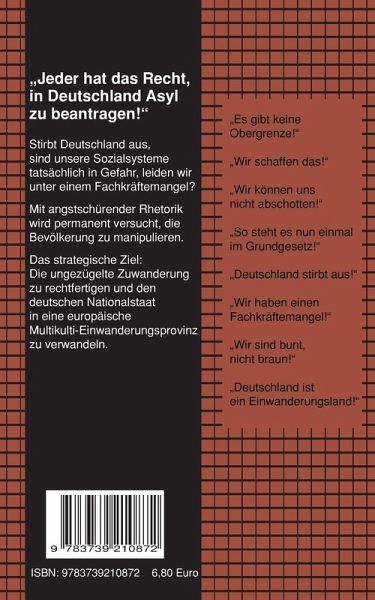 Menschlichkeit kennt keine Grenzen. Dummheit aber auch nicht! Eine naive Willkommenskultur stürzt Deutschland ins Chaos. Der Versuch, Deutschland in einen Schmelztiegel für Flüchtlinge zu verwandeln, führt geradewegs in die Katastrophe. Die wirtschaftliche Scheinblüte, ausgelöst durch die Billiggeldschwemme, das Währungsdumping und den Ölpreisverfall, scheint vielen Gutmenschen den Verstand geraubt zu haben.Wer "REFUGEES WELCOME - ÖFFNET ALLE GRENZEN!" plakatiert, weiß vermutlich gar nicht, was er damit anrichtet. Deutschland kann nicht zigmillionen Notleidende aus fernen Ländern und Kulturen aufnehmen - seien es nun Wirtschafts- oder Kriegsflüchtlinge.Dieses Büchlein ist als Weckruf gedacht, um das drohende Unheil doch noch abzuwenden und die dummdreiste Pro-Asyl-Propaganda zu enttarnen. Klappentext:Stirbt Deutschland aus, sind unsere Sozialsysteme tatsächlich in Gefahr, leiden wir unter einem Fachkräftemangel?Mit angstschürender Rhetorik wird permanent versucht, die Bevölkerungzu manipulieren. Das strategische Ziel: Die ungezügelte Zuwanderung nach Deutschland zu rechtfertigen und den deutschen Nationalstaat in eine europäische Multikulti-Einwanderungsprovinz zu verwandeln.