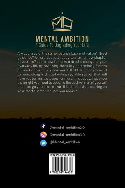 Are you tired of the same routine? Lack motivation? Need guidance? Or are you just ready to start a new chapter of your life? Learn how to make a drastic change to your everyday life by reviewing three key determining factors outlined in this book, giving you "THE TRUTH" that you need to hear, along with captivating real-life stories that will have you turning the pages for more. This book will give you the insight you need to become the best version of yourself and change your life forever. It is time to start working on your Mental Ambition. Are you ready?