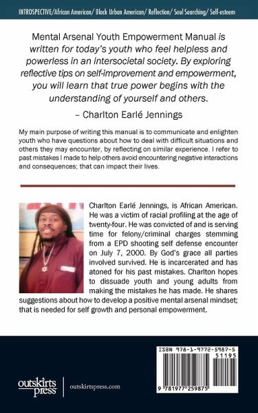 Mental Arsenal Youth Empowerment Manual is written for today's youth who feel helpless and powerless in an intersocietal society. By exploring reflective tips on self-improvement and empowerment, you will learn that true power begins with the understanding of yourself and others. ~ Charlton Earlé Jennings My main purpose of writing this manual is to communicate and enlighten youth who have questions about how to deal with difficult situations and others they may encounter, by reflecting on similar experience. I refer to past mistakes I made to help others avoid encountering negative interactions and consequences; that can impact their lives. Charlton Earlé Jennings, is African American. He was a victim of racial profiling at the age of twenty-four. He was convicted of and is serving time for felony/criminal charges stemming from a EPD shooting self defense encounter on July 7, 2000. By God's grace all parties involved survived. He is incarcerated and has atoned for his past mistakes. Charlton hopes to dissuade youth and young adults from making the mistakes he has made. He shares suggestions about how to develop a positive mental arsenal mindset; that is needed for self growth and personal empowerment.