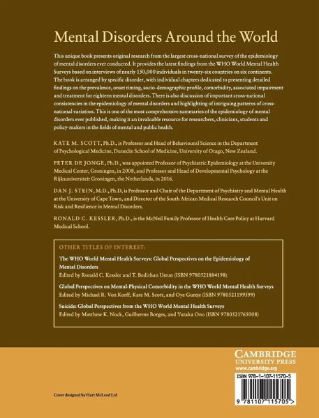 This unique book presents original research from the largest cross-national survey of the epidemiology of mental disorders ever conducted. It provides the latest findings from the WHO World Mental Health Surveys based on interviews of nearly 150,000 individuals in twenty-six countries on six continents. The book is ordered by specific disorder, with individual chapters dedicated to presenting detailed findings on the prevalence, onset timing, sociodemographic profile, comorbidity, associated impairment and treatment for eighteen mental disorders. There is also discussion of important cross-national consistencies in the epidemiology of mental disorders and highlighting of intriguing patterns of cross-national variation. This is one of the most comprehensive summaries of the epidemiology of mental disorders ever published, making this an invaluable resource for researchers, clinicians, students and policy-makers in the fields of mental and public health.
