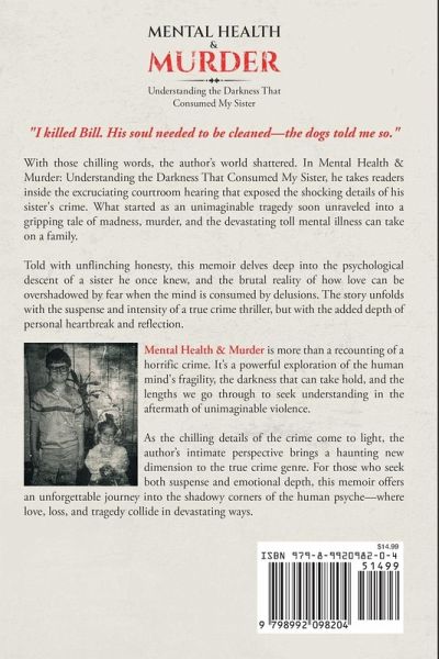 "Mental Health & Murder: Understanding the Darkness That Consumed My Sister" "I killed Bill. His soul needed to be cleaned-the dogs told me so." With those chilling words, the author's world was shattered. What began as an unimaginable tragedy unraveled into a devastating story of mental illness, family bonds, and the fragile line between love and fear. In this gripping true crime memoir, the author takes readers inside the courtroom where shocking revelations exposed the depth of his sister's mental unraveling. Through raw and unflinching honesty, he reflects on the haunting events that led to that fateful day and the lasting impact on those left behind. But this book is about more than a crime-it's a heartfelt exploration of the human mind's fragility, the complexities of family, and the resilience needed to confront unimaginable loss. Mental Health & Murder shines a light on mental health awareness, offering a poignant reminder of the urgent need for understanding and compassion in the face of darkness. Perfect for readers of true crime, memoirs, and stories that delve into the depths of the human experience, this unforgettable book will stay with you long after the final page.