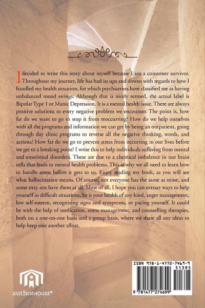 Enjoy reading my book, as you will see what hallucination means. Of course, not everyone has the same as mine, and some may not have them at all. Most of all, I hope you can extract ways to help yourself in difficult situations, be it your health of any kind, anger management, low self-esteem, recognizing signs and symptoms, or pacing yourself. It could be with the help of medication, stress management, and counselling therapies, both on a one-on-one basis and a group basis, where we share all our ideas to help keep one another afloat.