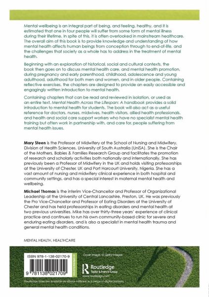 Mental wellbeing is an integral part of being, and feeling, healthy, and it is estimated that one in four people will suffer from some form of mental illness during their lifetime. In spite of this, it is often overlooked in mainstream healthcare. The overall aim of this book is to provide knowledge and understanding of how mental health affects human beings from conception through to end-of-life, and the challenges that society as a whole has to address in the treatment of mental health.