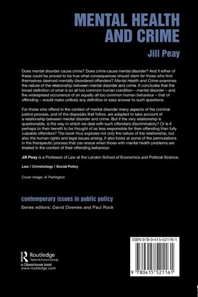 Does mental disorder cause crime? Does crime cause mental disorder? And if either of these could be proved to be true what consequences should stem for those who find themselves deemed mentally disordered offenders? Mental Health and Crime examines the nature of the relationship between mental disorder and crime. It concludes that the broad definition of what is an all too common human condition - mental disorder - and the widespread occurrence of an equally all too common human behaviour - that of offending - would make unlikely any definitive or easy answer to such questions. For those who offend in the context of mental disorder, many aspects of the criminal justice process, and of the disposals that follow, are adapted to take account of a relationship between mental disorder and crime. But if the very relationship is questionable, is the way in which we deal with such offenders discriminatory? Or is it perhaps to their benefit to be thought of as less responsible for their offending than fully culpable offenders? The book thus explores not only the nature of the relationship, but also the human rights and legal issues arising. It also looks at some of the permutations in the therapeutic process that can ensue when those with mental health problems are treated in the context of their offending behaviour.