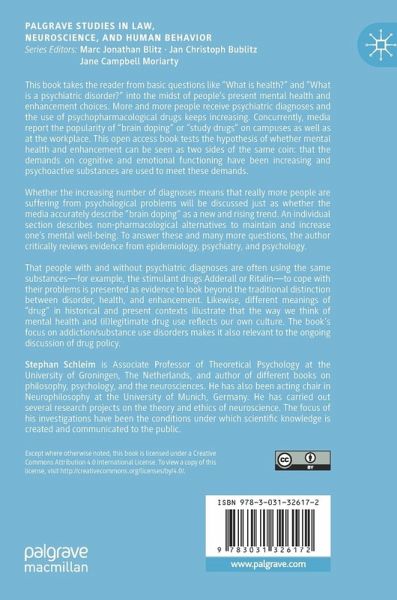 This book takes the reader from basic questions like "What is health?" and "What is a psychiatric disorder?", into the midst of people's present mental health and enhancement choices. More and more people receive psychiatric diagnoses and the use of psychopharmacological drugs keeps increasing. Concurrently, media report the popularity of "brain doping" or "study drugs" on campuses as well as at the workplace. This open access book tests the hypothesis of whether mental health and enhancement can be seen as two sides of the same coin: that the demands on cognitive and emotional functioning have been increasing and psychoactive substances are used to meet these demands.