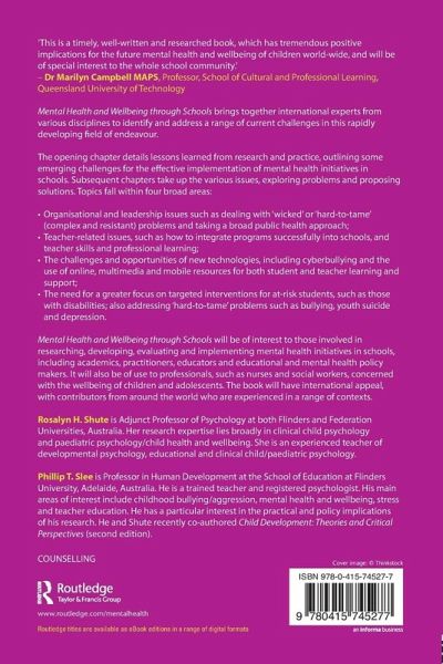 Mental Health and Wellbeing through Schools brings together international experts from various disciplines to identify and address a range of current challenges in this rapidly-developing field of endeavour. ¿ The opening chapter details lessons learned from research and practice, outlining some emerging challenges for the effective implementation of mental health initiatives in schools. Subsequent chapters take up the various issues, exploring problems and proposing solutions. Topics fall within four broad areas:¿ ¿ Organisational and leadership issues such as dealing with 'wicked' or 'hard-to-tame' (complex and resistant) problems and taking a broad public health approach;¿ Teacher-related issues, such as how to integrate programs successfully into schools, and teacher skills and professional learning;¿ The challenges and opportunities of new technologies, including cyberbullying and the use of online, multimedia and mobile resources for both student and teacher learning and support; The need for a greater focus on targeted interventions for at-risk students, such as those with disabilities; also addressing 'hard-to-tame' problems such as bullying, youth suicide and depression.¿¿ ¿ Mental Health and Wellbeing through Schools will be of interest to those involved in researching, developing, evaluating and implementing mental health initiatives in schools, including academics, practitioners, educators and educational and Mental Health policy makers. It will also be of use to professionals, such as nurses and social workers, concerned with the wellbeing of children and adolescents. The book will have international appeal, with contributors from around the world, experienced in a range of contexts. ¿ Rosalyn H. Shute is Adjunct Professor of Psychology at both Flinders and Federation Universities (Australia). Her research expertise lies broadly in clinical child psychology and paediatric psychology/child health and wellbeing. She is an experienced teacher of Developmental Psychology, educational and clinical child/paediatric psychology. ¿ Phillip T. Slee is a Professor in Human Development in the School of Education at Flinders University, Adelaide, Australia. He is a trained teacher and registered psychologist. His main areas of interest include childhood bullying/aggression, mental health and wellbeing, stress and teacher education. He has a particular interest in the practical and policy implications of his research. He and Shute recently co-authored Child Development: Theories and Critical Perspectives.