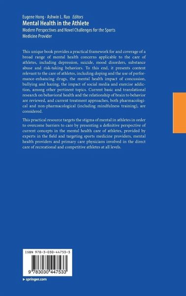 The Stigma of Mental Illness in Athletics.- Screening for Mental Health Conditions in Athletes.- Depression in Athletes: Incidence, Prevalence, and Comparisons to the Non-Athletic Population.- Suicide in Athletes: Are Athletes at Greater Risk?- Managing Psychiatric Disorders in Athletes.- ADHD in Athletes: Treatment and Considerations for Competition.- Risk-Taking Behaviors in Athletes.- The Psychological Response to Injury.- Substance Abuse and Sport.- Coping with Doping: PEDs in the Athletic Culture.- The Female Athlete Triad and Relative Energy Deficiencies in Athletes.- The Mental Health Manifestations of Concussion.- Bullying and Hazing in Athletic Culture.- The Impact of Social Media on Mental Health.- Mental Health in the Pediatric Athlete.- Exercise Addiction.- The Cellular and Physiological Basis of Behavioral Health: Basic and Translational Research.- An Update on Translational Research: The Brain and Behavior Relationship.- Non-Pharmacologic Approaches to Mental Health in Athletes.- Mindfulness Approaches to Athlete Well-Being.- Administrating Mental Health: Societal, Coaching, and Legislative Approaches to Mental Health.- Sports Psychology Demystified: Performance Versus Clinical Psychology - What's the Difference and Why Does It Matter?- Exercise as a Prescription for Mental Health.