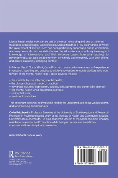 In Mental Health Social Work, Colin Pritchard draws on his many years of experience in research, teaching and practice in order to explore key issues for social workers who want to work in the mental health field. Mental health social work can be one of the most rewarding and one of the most frustrating areas of social work practice. Social workers need to have a good knowledge of interventions and their evidence bases, from pharmacology to psychotherapy, but also be able to work sensitively and effectively with both clients and carers in a rapidly changing context. Based on a series of case studies and research based practice, the book explores key topics including: the multiple factors affecting mental health the bio-psycho-social model of practice key areas including depression, suicide, schizophrenia and personality disorder the mental healthâ¿"child protection interface residential work treatment modalities. Presenting new and challenging research findings in this field, this book will be invaluable reading for undergraduate social work students and for practising social workers.