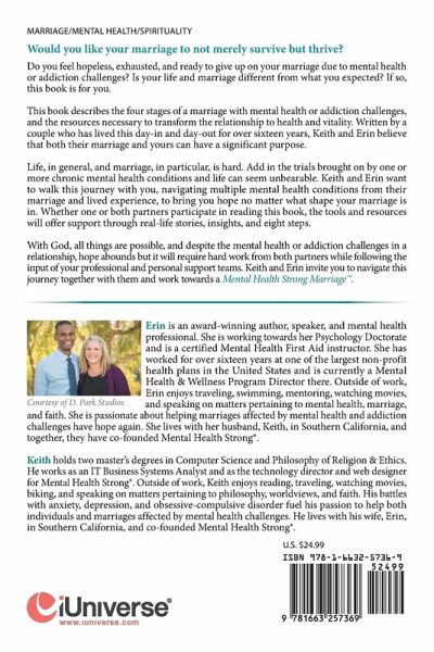 Do you feel hopeless, exhausted, and ready to give up on your marriage due to mental health or addiction challenges? Is your life and marriage different from what you expected? If so, this book is for you. This book describes the four stages of a marriage with mental health or addiction challenges, and the resources necessary to transform the relationship to health and vitality. Written by a couple who has lived this day-in and day-out for over sixteen years, Keith and Erin believe that both their marriage and yours can have a significant purpose. Life, in general, and marriage, in particular, is hard. Add in the trials brought on by one or more chronic mental health conditions and life can seem unbearable. Keith and Erin walk this journey with you, navigating six mental health conditions from their marriage and lived experience, to bring you hope no matter what shape your marriage is in. Whether one or both partners participate in reading this book, the tools and resources will offer support through real-life stories, insights, and eight steps to have a Mental Health Strong Marriage. With God, all things are possible, and despite the mental health or addiction challenges in a relationship, hope abounds but it will require hard work from both partners while following the input of professional and personal support teams. Keith and Erin invite you to navigate this journey together with them and work towards a Mental Health Strong Marriage.