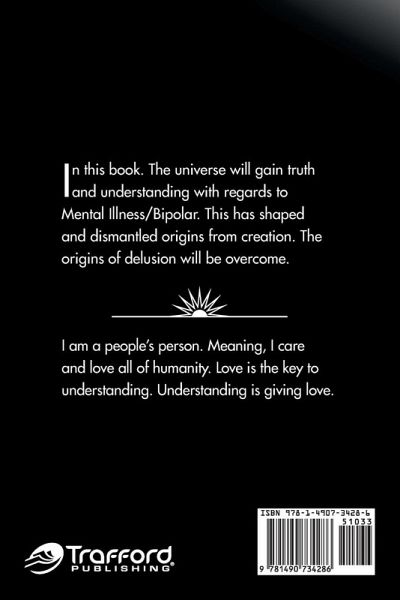 In this book. The universe will gain truth and understanding with regards to Mental Illness / Bipolar. This has shaped and dismantled origins from creation. The origins of delusion will be overcome.