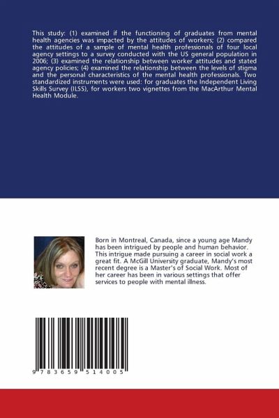 This study: (1) examined if the functioning of graduates from mental health agencies was impacted by the attitudes of workers; (2) compared the attitudes of a sample of mental health professionals of four local agency settings to a survey conducted with the US general population in 2006; (3) examined the relationship between worker attitudes and stated agency policies; (4) examined the relationship between the levels of stigma and the personal characteristics of the mental health professionals. Two standardized instruments were used: for graduates the Independent Living Skills Survey (ILSS), for workers two vignettes from the MacArthur Mental Health Module.