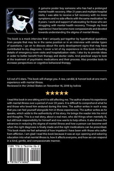The book is a mock interview that I uniquely put together by hypothetical questions from people that may be in the same position or in an interview with similar types of questions. I go on to discuss about the early development signs that may have contributed to my diagnosis. I cover a lot of my experience in this book including details of emergency room visits and hospitalization visits. I also try to provide ideas in order to better benefit from therapy and doctor visits. And practical ways to look at the treatment of psychiatric medications and their process. Also provides tools to increase perspectives on cognitive behavioral therapy.