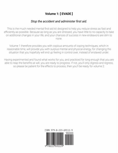 Volume 1: [ EVADE ] Stop the accident and administer first aid. This is the much needed mental first-aid kit designed to help you reduce stress as fast and efficiently as possible. Because as long as you are stressed, you have little to no capacity to take on additional changes in your life, and your chances of success in new endeavors are slim to none. Volume 1 therefore provides you with copious amounts of coping techniques, which in reasonable time, will provide you with surplus mental and physical energy, for changing the situation that you hopefully will end up feeling in control over, instead of enslaved under. Having experimented and found what works for you, and practiced for long enough that you are able to reap the benefits at will, you are ready to progress. If not, you'll only digress and regress, so please be patient for the effects to process, then you'll be ready for volume 2.