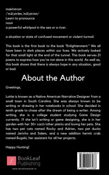 """""" mael·strom /¿m¿l¿sträm,¿m¿l¿str¿m/ Learn to pronounce noun a powerful whirlpool in the sea or a river. a situation or state of confused movement or violent turmoil. This book is the first book to the book """"""""Enlightenment."""""""" We all have been in dark places within our lives. We actively looked for that small light at the end of the tunnel. This book serves 21 poems to express how you're not alone in this world. As well as, this book shows that there is always hope in any situation, good or bad.""""""