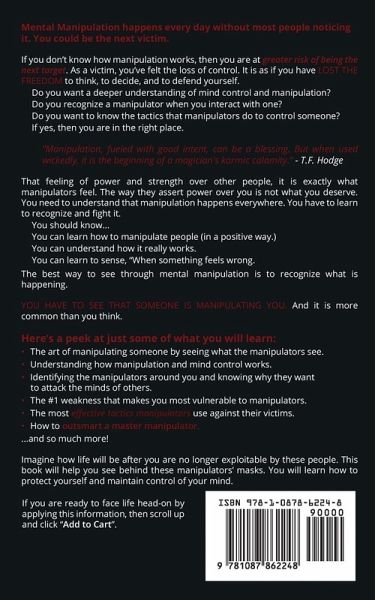 Mental Manipulation happens every day without most people noticing it. You could be the next victim. If you don’t know how manipulation works, then you are at greater risk of being the next target. As a victim, you’ve felt the loss of control. It is as if you have LOST THE FREEDOM to think, to decide, and to defend yourself. Do you want a deeper understanding of mind control and manipulation? Do you recognize a manipulator when you interact with one? Do you want to know the tactics that manipulators do to control someone? If yes, then you are in the right place. "Manipulation, fueled with good intent, can be a blessing. But when used wickedly, it is the beginning of a magician's karmic calamity." - T.F. Hodge That feeling of power and strength over other people, it is exactly what manipulators feel. The way they assert power over you is not what you deserve. You need to understand that manipulation happens everywhere. You have to learn to recognize and fight it. You should know… You can learn how to manipulate people (in a positive way.) You can understand how it really works. You can learn to sense, "When something feels wrong." The best way to see through mental manipulation is to recognize what is happening. YOU HAVE TO SEE THAT SOMEONE IS MANIPULATING YOU. And it is more common than you think. Here’s a peek at just some of what you will learn: The art of manipulating someone by seeing what the manipulators see. Understanding how manipulation and mind control works. Identifying the manipulators around you and knowing why they want to attack the minds of others. The #1 weakness that makes you most vulnerable to manipulators. The most effective tactics manipulators use against their victims. How to outsmart a master manipulator. ...and so much more! Imagine how life will be after you are no longer exploitable by these people. This book will help you see behind these manipulators’ masks. You will learn how to protect yourself and maintain control of your mind. If you are ready to face life head-on by applying this information, then scroll up and click "Add to Cart".