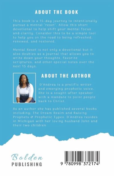 This book is a 15-day journey to intentionally pursue a mental "reset". Allow this short devotional to help shift your mental focus and clarity. Consider this to be a simple tool to help you on the road to being refreshed, renewed, and restored. Mental Reset is not only a devotional but it also doubles as a journal that allows you to write down your thoughts, favorite scriptures, and other special notes over the next 15 days.