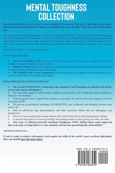 Do you often feel like you’re a slave to your emotions? Do you feel like you’ve lost sight of your goals, distracted by bad habits that have taken you off-path from your ideal life? Then you need to keep listening... The Ancient Greco-Roman philosophy of Stoicism, hailing from 300 B.C, believes that the path to happiness lies in the freedom from our emotions. To not be controlled by each thought and feeling, and accept each moment with self-awareness is to align ourselves with the natural order of the universe, and find complete fulfillment. Even today, millenniums after his death, his teachings are followed globally as a means to end all needless suffering and connect to a deeper life purpose. This includes three books: Stoicism in Modern Life: discover how to develop your self-awareness, improve your mental toughness and self-discipline in today’s world Influence People 2.0: proven methods to analyze people, control your emotions and body language, leverage persuasion in business and relationships The Mindful Path to Self-Compassion: practical exercises to strengthen your willpower and overcome procrastination by creating atomic habits Here's a short preview of what you'll discover: The secrets to INSTANTLY mastering your emotions (You’ll navigate any situation life throws at you with reason and dignity!) The vital tools needed to build mental toughness and overcome ANY challenge without feeling defeated or overwhelmed. Fourteen genius ways to apply Stoic wisdom to your daily life and rise above the negativity of modern culture NOW. The proven psychological techniques for BOOSTING your willpower and defeating laziness once and for all. How to effectively beat procrastination and other persistent habits that are sabotaging your productivity. How to set up morning and evening routines that lead to better focus and lasting positive change. A step-by-step guide to reverse psychology and getting people to enjoy giving you what you want. Nine ways to cultivate powerful emotional intelligence NOW. (Follow these expert-approved tips to develop a strong hold over your emotions and become psychologically untouchable!) And much, much more… If you’re ready to achieve self-mastery and acquire the skills of the world’s most excellent individuals, then you should start this book today!