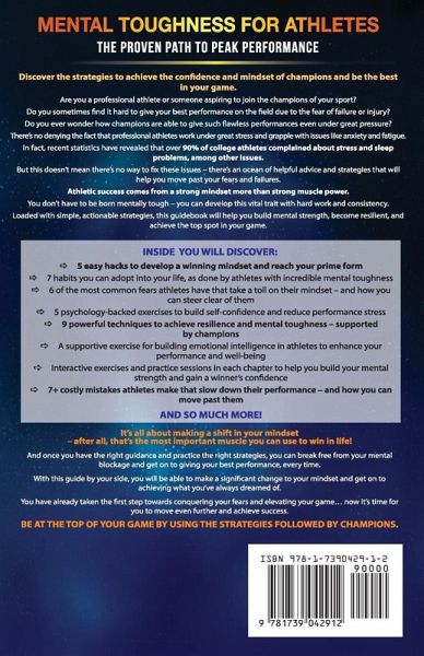 Unleash your inner champion and dominate your sport with the mindset of Olympic athletes! Are you a professional athlete or aspiring to join the champions of your sport? Do you sometimes find it hard to give your best performance on the field due to the fear of failure or injury? There's no denying the fact that professional athletes work under stress and grapple with issues like anxiety and fatigue. In fact, recent statistics have revealed that over 90% of college athletes complained about stress and sleep problems, among other issues. But this doesn't mean there's no way to fix these issues. Athletic success comes from a strong mindset more than strong muscle power. You don't have to be born mentally tough - you can develop this vital trait with hard work and consistency. Loaded with simple, actionable strategies, this book will help you build mental strength, become resilient, and achieve the top spot in your game. Inside, you will discover:5 easy hacks to develop a winning mindset and reach your prime form 7 habits you can adopt into your life, as done by athletes with incredible mental toughness 6 of the most common fears athletes have that take a toll on their mindset - and how you can steer clear of them 5 psychology-backed exercises to build self-confidence and reduce performance stress 9 powerful techniques to achieve resilience and mental toughness - supported by Olympic champions A supportive exercise for building emotional intelligence in athletes to enhance your performance and well-being Interactive exercises and practice sessions in each chapter to help you build your mental strength and gain a winner's confidence 7+ costly mistakes athletes make that slow down their performance - and how you can move past them And so much more! It's all about making a shift in your mindset - after all, that's the most important muscle you can use to win in life! And once you have the right guidance and practice the right strategies, you can break free from your mental blockage and get on to giving your best performance, every time. With this guide by your side, you will be able to make a significant change to your mindset and get on to achieving what you've always dreamed of. You've already taken the first step towards conquering your fears and elevating your game... now it's time for you to move even further and achieve success. If you want to be at the top of your game by using the strategies followed by champions, then scroll up and click the "Add to Cart" button right now.