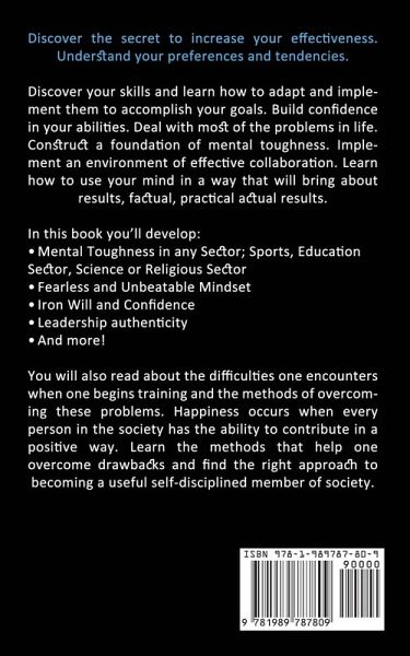 Discover the secret to increase your effectiveness. Understand your preferences and tendencies. Discover your skills and learn how to adapt and implement them to accomplish your goals. Build confidence in your abilities. Deal with most of the problems in life. Construct a foundation of mental toughness. Implement an environment of effective collaboration. Learn how to use your mind in a way that will bring about results, factual, practical actual results. In this book you'll develop: • Mental Toughness in any Sector; Sports, Education Sector, Science or Religious Sector • Fearless and Unbeatable Mindset • Iron Will and Confidence • Leadership authenticity • And more! You will also read about the difficulties one encounters when one begins training and the methods of overcoming these problems. Happiness occurs when every person in the society has the ability to contribute in a positive way. Learn the methods that help one overcome drawbacks and find the right approach to becoming a useful self-disciplined member of society.