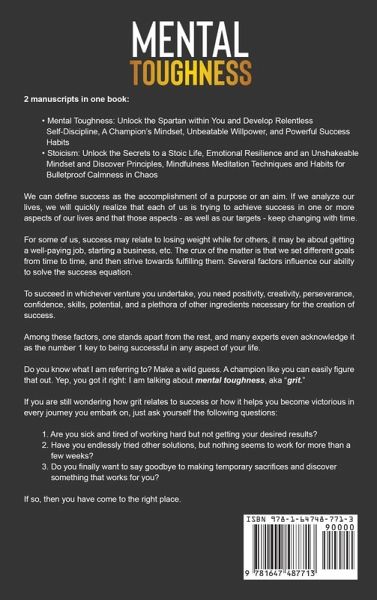 If you've always wanted to have an unshakable mindset but are often discouraged by failure, criticism, rejection, and mistakes, then keep reading... Two manuscripts in one book:Mental Toughness: Unlock the Spartan within You and Develop Relentless Self-Discipline, A Champion's Mindset, Unbeatable Willpower, and Powerful Success Habits Stoicism: Unlock the Secrets to a Stoic Life, Emotional Resilience and an Unshakeable Mindset and Discover Principles, Mindfulness Meditation Techniques and Habits for Bulletproof Calmness in Chaos Are you sick and tired of negative thoughts and events always pulling you down? Have you tried all manner of solutions and hacks that promise to turn things around, yet nothing seems to have any lasting effects? Do you finally want to say goodbye to failure and discover something, which works for you? If so, then you've come to the right place. You see, developing the mental toughness you need to achieve your goals doesn't have to be difficult. Even if you've tried all manner of other solutions that didn't work. In fact, it's easier than you think. You see, mental toughness is the mindset that people adopt in what they do. It is a personality trait that defines what your mind is made up of and is partly responsible for how you behave or how you react to various situations. Personality is the characteristic pattern of feeling, thinking, and acting of an individual that is inherently different in every person.. This book seeks to enlighten you about the little-known power of mental toughness and how some people have used it to achieve great success. If you have been struggling with your ability to think rationally and control your emotions when under pressure, you are in the right place. Some of the topics covered in part 1 of this book include:Everything you need to know about mental toughness How to differentiate between a strong mentality and a weak mentality How to unlock the inner Spartan in you and overcome your fears and insecurities How to identify pitfalls and mistakes that decrease your mental toughness How to spot habits that contribute to a weak mentality and tips on how to stop them How to develop mental toughness when under pressure and respond positively to obstacles in your way The 40-percent rule of mental toughness and how to use it to achieve success The importance of emotional strength and how it affects your success, plus practical tips for developing emotional resilience How to acquire self-discipline and willpower for a tougher mindset Some of the topics covered in part 2 of this book include:Everything You Need to be Happy is Found Within The Power of Stoicism Philosophy For a Better Life Learn How to Overcome Self-doubt, Self-Criticism, and Feelings of Inadequacy 5 Actionable Mind Training Strategies to Eliminate Self-Defeating Thoughts Master the Art of Tranquility with Stoic Techniques Stoic Principles to Smash Creative Blocks Differentiating Things We Can and Can't Control How to Control Emotions and Minimize Worry with Stoicism Stoicism and Cognitive Behavioral Therapy Inspiring Stories from Popular Stoic Followers A Complete Stoic Guide for Perfect Health And much, much more! So if you want to learn more about Mental Toughness and Stoicism, scroll up and click the "add to cart" button!