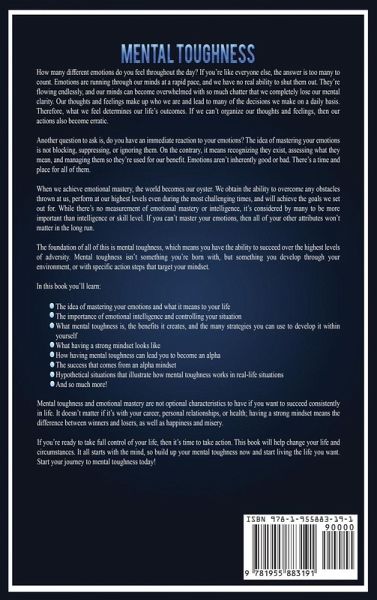 How many different emotions do you feel throughout the day? If you're like everyone else, the answer is too many to count. Emotions are running through our minds at a rapid pace, and we have no real ability to shut them out. They're flowing endlessly, and our minds can become overwhelmed with so much chatter that we completely lose our mental clarity. Our thoughts and feelings make up who we are and lead to many of the decisions we make on a daily basis. Therefore, what we feel determines our life's outcomes. If we can't organize our thoughts and feelings, then our actions also become erratic... Another question to ask is, do you have an immediate reaction to your emotions? The idea of mastering your emotions is not blocking, suppressing, or ignoring them. On the contrary, it means recognizing they exist, assessing what they mean, and managing them so they're used for your benefit. Emotions aren't inherently good or bad. There's a time and place for all of them... When we achieve emotional mastery, the world becomes our oyster. We obtain the ability to overcome any obstacles thrown at us, perform at our highest levels even during the most challenging times, and achieve the goals we set out for. While there's no measurement of emotional mastery or intelligence, it's considered by many to be more important than intelligence or skill level. If you can't master your emotions, then all of your other attributes won't matter in the long run... The foundation of all of this is mental toughness, which means you have the ability to succeed over the highest levels of adversity. Mental toughness isn't something you're born with, but something you develop through your environment, or with specific action steps that target your mindset... In this book you'll learn: What mental toughness is, the benefits it creates, and the many strategies you can use to develop it within yourself The idea of mastering your emotions and what it means to your life The importance of emotional intelligence and controlling your situation What having a strong mindset looks like How having mental toughness can lead you to become an alpha The success that comes from an alpha mindset Hypothetical situations that illustrate how mental toughness works in real-life situations And so much more! Mental toughness and emotional mastery are not optional characteristics to have if you want to succeed consistently in life. It doesn't matter if it's with your career, personal relationships, or health; having a strong mindset means the difference between winners and losers, as well as happiness and misery... If you're ready to take full control of your life, then it's time to take action. This book will help change your life and circumstances. It all starts with the mind, so build up your mental toughness now and start living the life you want. Get this book and start your journey to mental toughness today! Grab your copy of Mental Toughness now!