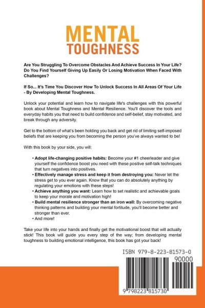 Are You Struggling To Overcome Obstacles And Achieve Success In Your Life? Do You Find Yourself Giving Up Easily Or Losing Motivation When Faced With Challenges? If So... It's Time You Discover How To Unlock Success In All Areas Of Your Life - By Developing Mental Toughness. Unlock your potential and learn how to navigate life's challenges with this powerful book about Mental Toughness and Mental Resilience. You'll discover the tools and everyday habits that you need to build confidence and self-belief, stay motivated, and break through any adversity. Get to the bottom of what's been holding you back and get rid of limiting self-imposed beliefs that are keeping you from becoming the person you've always wanted to be! With this book by your side, you will:Adopt life-changing positive habits: Become your #1 cheerleader and give yourself the confidence boost you need with these positive self-talk techniques that turn negatives into positives. Effectively manage stress and keep it from destroying you: Never let the stress get to you ever again. Know that you can do absolutely anything by regulating your emotions with these steps! Achieve anything you want: Learn how to set realistic and achievable goals to keep your morale and motivation high! Build mental resilience stronger than an iron wall: By overcoming negative thinking patterns and building your mental fortitude, you'll become better and stronger than ever. And more! Take your life into your hands and finally get the motivational boost that will actually stick! This book will guide you every step of the way; from developing mental toughness to building emotional intelligence, this book has got your back!
