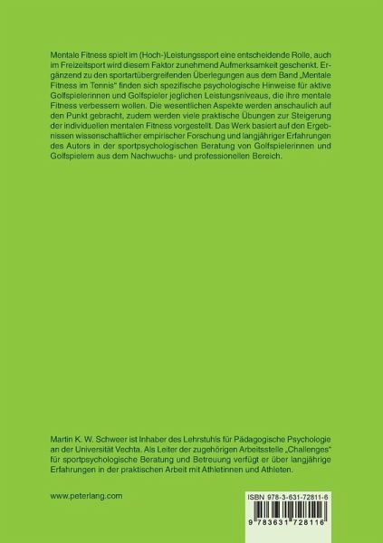 Mentale Fitness spielt im (Hoch-)Leistungssport eine entscheidende Rolle, auch im Freizeitsport wird diesem Faktor zunehmend Aufmerksamkeit geschenkt. Ergänzend zu den sportartübergreifenden Überlegungen aus dem Band «Mentale Fitness im Tennis» finden sich spezifische psychologische Hinweise für aktive Golfspielerinnen und Golfspieler jeglichen Leistungsniveaus, die ihre mentale Fitness verbessern wollen. Die wesentlichen Aspekte werden anschaulich auf den Punkt gebracht, zudem werden viele praktische Übungen zur Steigerung der individuellen mentalen Fitness vorgestellt. Das Werk basiert auf den Ergebnissen wissenschaftlicher empirischer Forschung und langjähriger Erfahrungen des Autors in der sportpsychologischen Beratung von Golfspielerinnen und Golfspielern aus dem Nachwuchs- und professionellen Bereich.