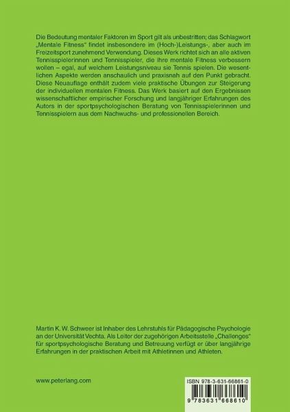 Die Bedeutung mentaler Faktoren im Sport gilt als unbestritten; das Schlagwort "Mentale Fitness" findet insbesondere im (Hoch-)Leistungs-, aber auch im Freizeitsport zunehmend Verwendung. Dieses Werk richtet sich an alle aktiven Tennisspielerinnen und Tennisspieler, die ihre mentale Fitness verbessern wollen - egal, auf welchem Leistungsniveau sie Tennis spielen. Die wesentlichen Aspekte werden anschaulich und praxisnah auf den Punkt gebracht. Diese Neuauflage enthält zudem viele praktische Übungen zur Steigerung der individuellen mentalen Fitness. Das Werk basiert auf den Ergebnissen wissenschaftlicher empirischer Forschung und langjähriger Erfahrungen des Autors in der sportpsychologischen Beratung von Tennisspielerinnen und Tennisspielern aus dem Nachwuchs- und professionellen Bereich.