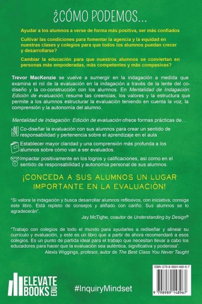 ¿CÓMO PODEMOS...Ayudar a los alumnos a verse de forma más positiva, ser más confiados Cultivar las condiciones para fomentar la agencia y la equidad en nuestras clases y colegios para que todos los alumnos puedan crecer y desarrollarse? Cambiar la educación para que nuestros alumnos se conviertan en personas más empoderadas, más competentes y más compasivas? Trevor MacKenzie se vuelve a sumergir en la indagación a medida que examina el rol de la evaluación en la indagación a través de la lente del co-diseño y la co-construcción con los alumnos. En Mentalidad de Indagación: Edición de evaluación, resume las creencias, los valores y la estructura que permite a los alumnos estructurar la evaluación teniendo en cuenta la voz, la comprensión y la autonomía del alumno. Mentalidad de Indagación: Edición de evaluación ofrece formas prácticas de...Co-diseñar la evaluación con sus alumnos para crear un sentido de responsabilidad y pertenencia sobre el aprendizaje en el aula Establecer mayor claridad y una comprensión más profunda a los alumnos sobre cómo van a ser evaluados. Impactar positivamente en los logros y calificaciones, así como en el sentido de responsabilidad y autonomía personal de sus alumnos. ¡CONCEDA A SUS ALUMNOS UN LUGAR IMPORTANTE EN LA EVALUACIÓN! "Si valora la indagación y busca desarrollar alumnos reflexivos, con iniciativa, consiga este libro. Está repleto de consejos y aliñado con cariño. Sus alumnos se lo agradecerán" -Jay McTighe, coautor de Understanding by Design® "Trabajo con colegios de todo el mundo para ayudarles a rediseñar y alinear su currículo y evaluación, y este es un libro que a partir de ahora recomendaré a esos colegios. Es un punto de partida ideal para el trabajo que necesitan llevar a cabo los educadores para hacer que la evaluación sea auténtica, significativa y poderosa". -Alexis Wiggings, profesor, autor de The Best Class You Never Taught