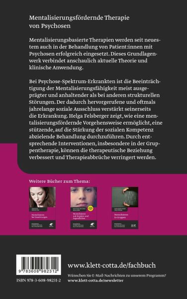 Der dadurch hervorgerufene und oftmals jahrelange soziale Ausschluss verstärkt seinerseits die Erkrankung. Die Autorin zeigt, wie es eine mentalisierungsfördernde Vorgehensweise ermöglicht, eine stützende, auf die Stärkung der sozialen Kompetenz abzielende Behandlung durchzuführen. Durch entsprechende kurze Interventionen können die therapeutische Beziehung verbessert und Therapieabbrüche verringert werden.