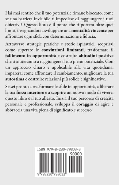 Hai mai sentito che il tuo potenziale rimane bloccato, come se una barriera invisibile ti impedisse di raggiungere i tuoi obiettivi? Questo libro è il ponte che ti porterà oltre quei limiti, insegnandoti a sviluppare una mentalità vincente per affrontare ogni sfida con determinazione e fiducia. Attraverso strategie pratiche e storie ispiratrici, scoprirai come superare le convinzioni limitanti, trasformare il fallimento in opportunità e costruire abitudini positive che ti aiuteranno a raggiungere il tuo pieno potenziale. Con un approccio chiaro e applicabile alla vita quotidiana, imparerai come affrontare il cambiamento, migliorare la tua autostima e costruire relazioni più solide e significative. Se sei pronto a trasformare le sfide in opportunità, a liberare la tua forza interiore e a scoprire un nuovo modo di vivere, questo libro è il tuo alleato. Inizia il tuo percorso di crescita personale e professionale, sviluppa il coraggio di agire e abbraccia una vita piena di significato e successo.