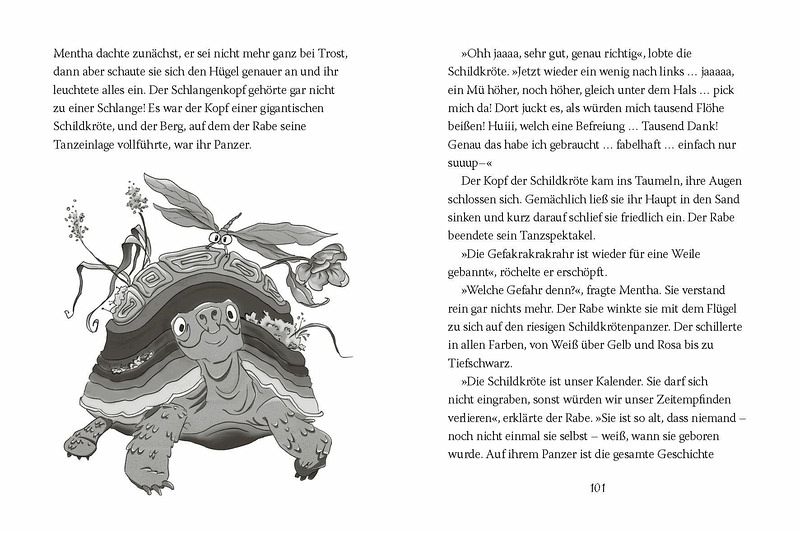Fledermäuse auf dem Boden schnarchen und in der Nacht die Sterne singen. Und sie kann sich - wenn sie sich wirklich konzentriert - unsichtbar machen. Eines Sommertages begegnet sie im Fluss am Haus einem Fisch, der für das Mädchen eine wichtige Botschaft hat. Bald darauf gelangt Mentha auf dem Rücken einer Fledermaus zu einer unbekannten Insel, auf der nur Tiere leben. Dort trifft sie auf den Bekümmertsten Bekümmerer, einen Raben, der ihr eröffnet, dass der Welt das Ende droht, weil die Menschen vergessen haben, sich an die guten Dinge im Leben zu erinnern. Menthas Aufgabe soll es sein, dem Gedächtnis der Leute wieder auf die Sprünge zu helfen.