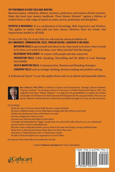 Top Performers in every field have Mentors. Business leaders, celebrities, athletes, investors, performers and teachers all have mentors. Make this book your mentor handbook. These Mentor Minutes(TM) capture a lifetime of wisdom from a wide range of experts in many careers, professions and disciplines. Expertise is measurable. It is a combination of Knowledge, Skill, Experience and Wisdom. This applies no matter what path you have chosen. However, there are certain vital requirements needed in all fields. To rise to the Top 1% of any field you will need the advanced abilities of: Self-Awareness, Communication, Sales, Problem Solving, Leadership & Influence. Motivation Skills to get yourself and others to do what needs to be done when it needs to be done, as it needs to be done, even when you don't feel like doing it. Relationship Intelligence® to connect with people and stay connected. Presentation Skills, Public Speaking, Storytelling and the ability to Lead Meetings Successfully. Sales & Marketing Skills, Communication, Business and Branding Strategies. Leadership skills such as strategic thinking, decision making and problem solving. A Professional Expert(TM) is one who applies these traits in an ethical and honorable fashion. Jim Cathcart, CSP, CPAE is a Mentor to Experts and Entrepreneurs. Through Cathcart Institute's "Experts Academy(TM)" he develops achievers to become a Certified Professional Expert, CPE(TM). Jim originally wrote these "Mentor Minutes(TM)" as a legacy for his grandchildren, to capture the wisdom and insights of a lifetime in the field of personal development for the next generations. Now you can tap the collective wisdom that Jim Cathcart has assembled and apply it to your own life and career. OUTCOMES: · Reach the Top 1% of your chosen field. Become a respected leader. · Be more confident because you are following a strategic path that will bear more fruit. · Clarify your dreams and vision of the future you want. · Become a Magnet for what you want. · Increase your charisma and ability to lead others. · No longer feel intimidated by "bigger" people than you, and you'll realize that you, too, are a substantial person worthy of success and admiration. · Become a more caring and sensitive person while at the same time being a strong confident leader. · Know how to make good decisions better than ever, better than most. · Find time to Think and know How to Think More Clearly. · Be able to lead and inspire your organization as never before. Let's discover How Much More Successful You Can Be!